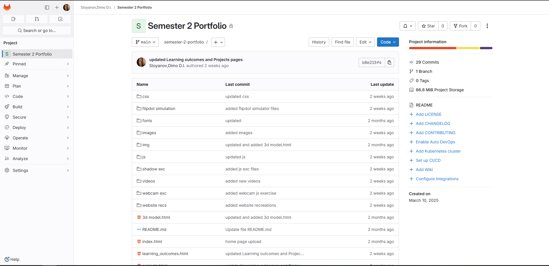 For version control, I used Git to track changes and progress during development. This allowed me to experiment with updates while keeping a clean history of my work and structure. Maintaining the repository helped me better understand the value of commit history and organization in real-world development workflows.