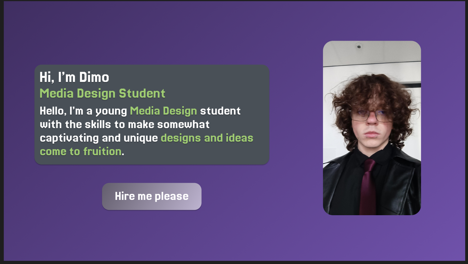 The last exercise was to design a personal landing page that would serve as a bold introduction and clearly show that I want to be hired. I focused on clear calls-to-action, eye-catching visuals, and a strong sense of my personal brand. The goal was to make the page stand out and leave no doubt about my intent and personality as a creative.