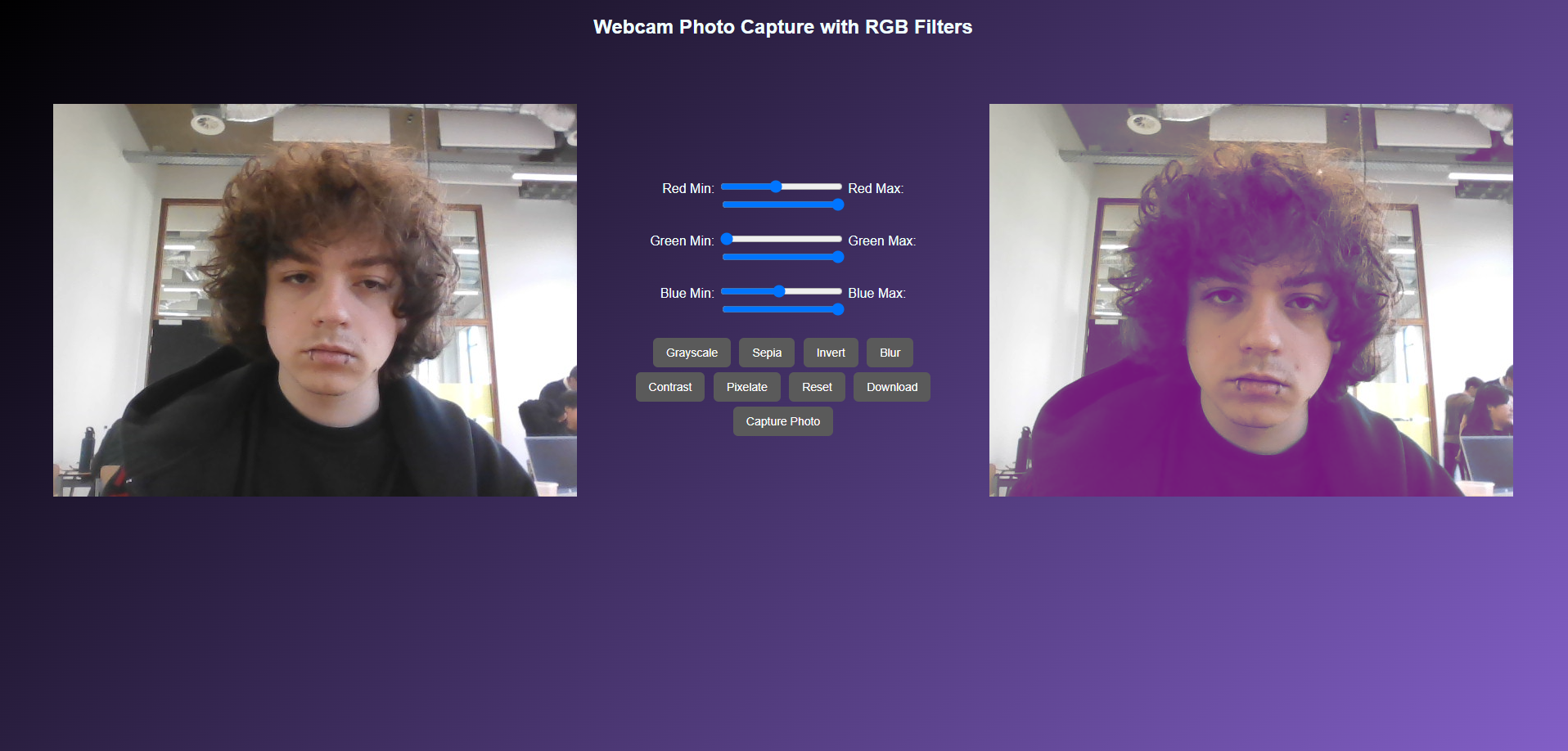 As part of my teacher Amer's coding challenges, I built a webcam photo website with filters like grayscale, sepia, blur, contrast, and pixelate. I used HTML5 media access to connect the webcam, and added a download feature to save filtered photos. This helped me improve my JavaScript skills and get hands-on with CSS filters and DOM manipulation. Amer appreciated the creativity and technical problem-solving I showed, especially how I made advanced features like live filters and download functionality work smoothly.