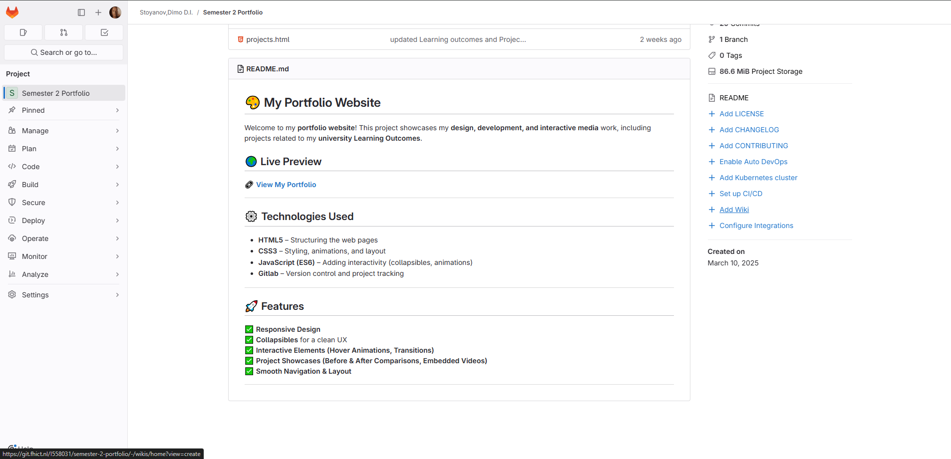 For version control, I used Git to track changes and progress during development. This allowed me to experiment with updates while keeping a clean history of my work and structure. Maintaining the repository helped me better understand the value of commit history and organization in real-world development workflows.